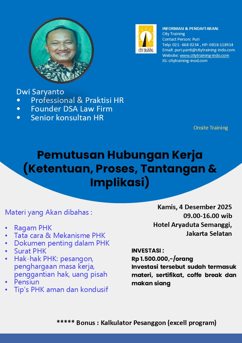 | 59 | Perhitungan Persanggon & Proses PHK & Pensiun | Jumat, 15 Agustus 2025 | 09.00-11.30 WIB | Zoom | Rp 200.000,- | Dwi Saryanto | |