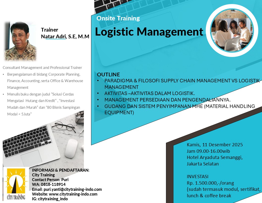 | 96 | Logustic Management | Kamis, 11 Desember 2025 | 09.00-17.00 WIB | Hotel Aryaduta Semanggi, Jakarta Selatan | Rp 1.500.000,- | Natar Adri | |