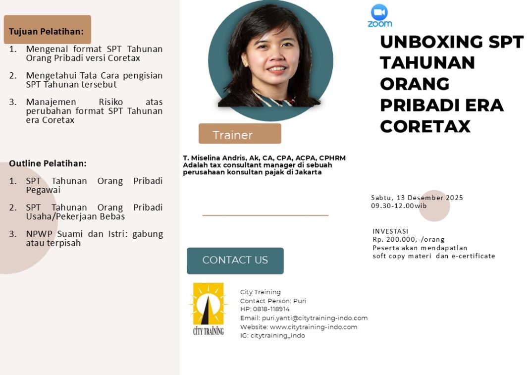 | 9 | Natura Tax | Sabtu, 25 Januari 2025 | 09.30-12.00 WIB | Zoom | Rp 200.000,- | Miselina Idris | |