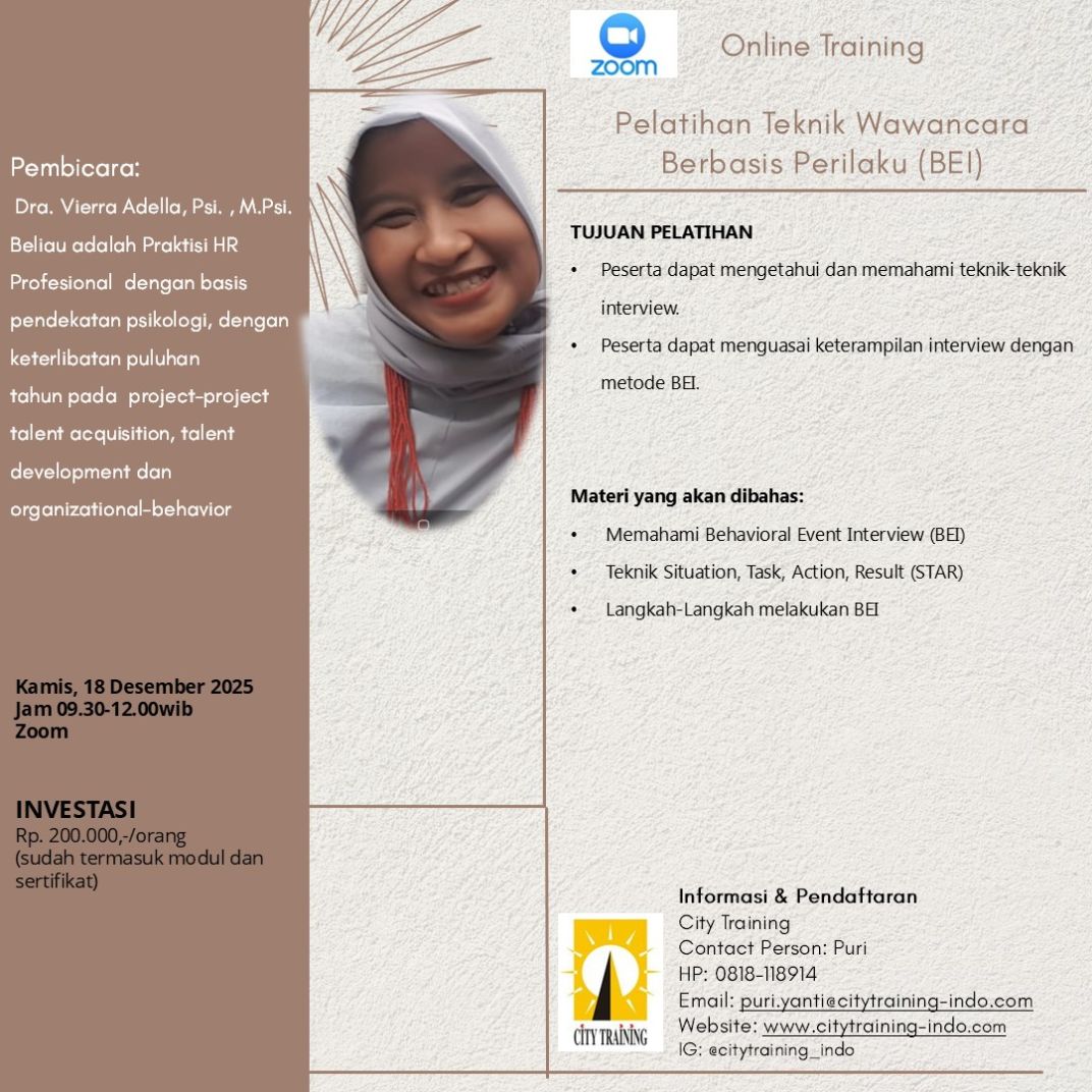| 95 | Teknik Wawancara untuk Recruitment : BEI | Rabu, 10 Desember 2025 | 09.30-12.00 WIB | Zoom | Rp 200.000,- | Viera Adella | |