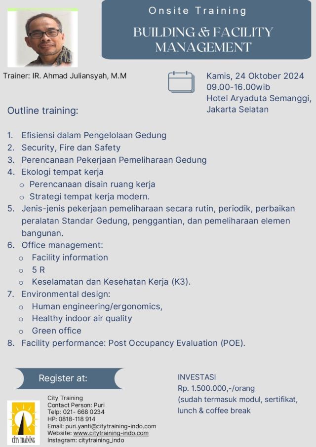 | 12 | Building & Facility Management | Selasa, 11 Februari 2025 | 09.00-17.00 WIB | Hotel Aryaduta Semanggi, Jakarta Selatan | Rp 1.500.000,- | Ahmad Juliansyah | |