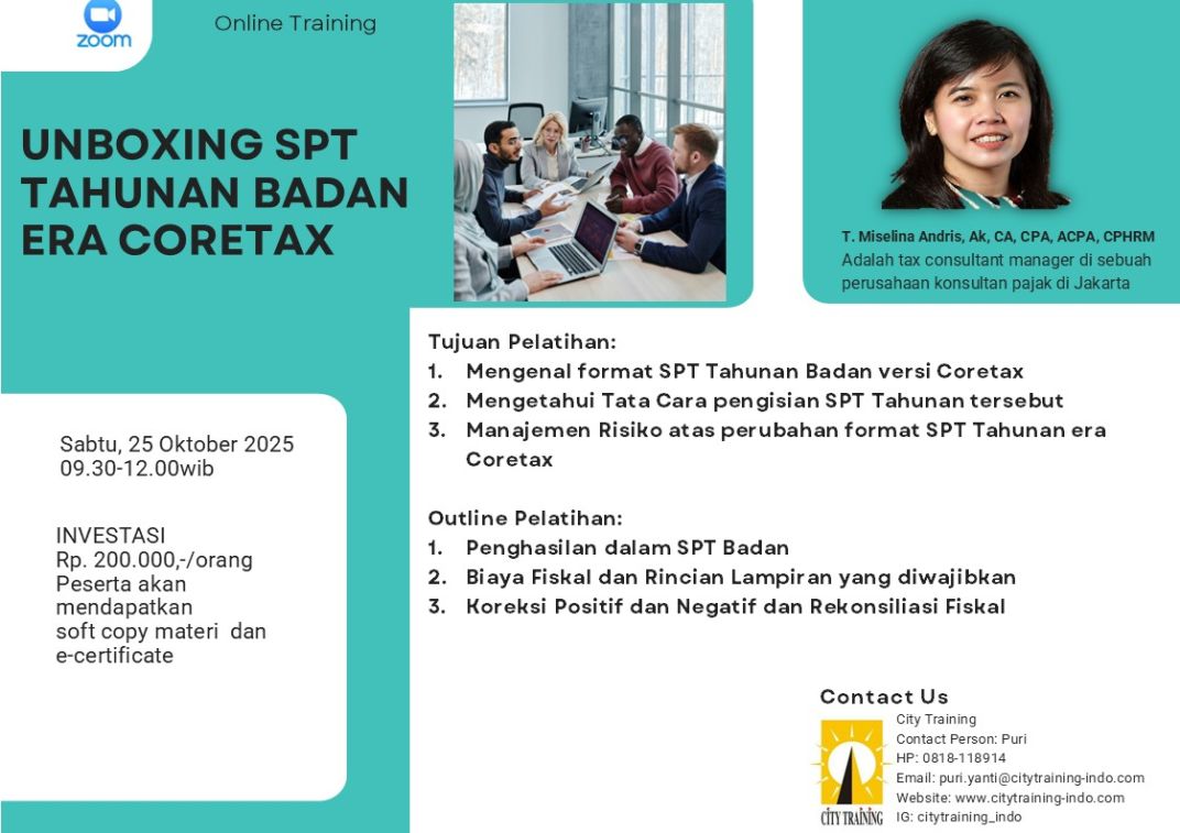 | 9 | Natura Tax | Sabtu, 25 Januari 2025 | 09.30-12.00 WIB | Zoom | Rp 200.000,- | Miselina Idris | |