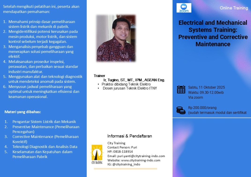 | 5 | LOTO (Log out Tag Out) | Sabtu, 18 Januari 2025 | 09.30-12.00 WIB | Zoom | Rp 200.000,- | Eka Fitriyati | |