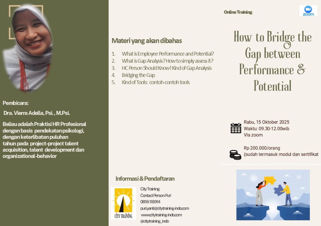 | 78 | How to Bridge The Gap Between Performance and Potential | Rabu, 15 Oktober 2025 | 09.30-12.00 WIB | Zoom | Rp 200.000 | Viera Adella | |