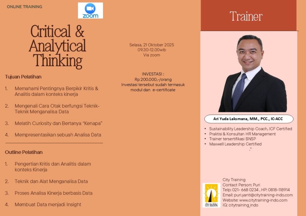 | 80 | Critical Thinking & Analysis | Selasa, 21 Oktober 2025 | 09.30-12.00 WIB | Zoom | Rp 200.000,- | Andi K utomo | |