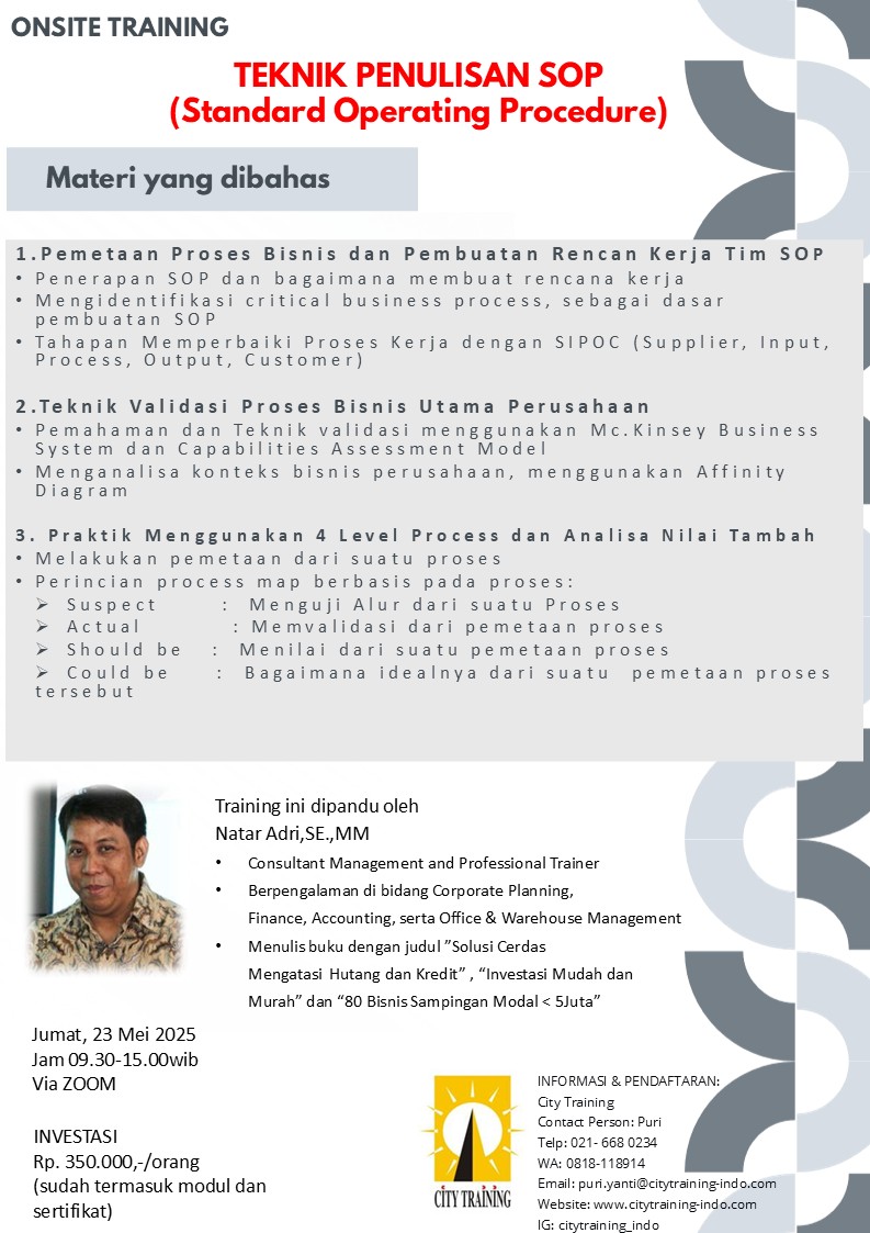 | 38 | Teknik Penulisan SOP | Jumat, 23 Mei 2025 | 09.00-15.00 WIB | Zoom | Rp 350.000,- | Natar Adri | |