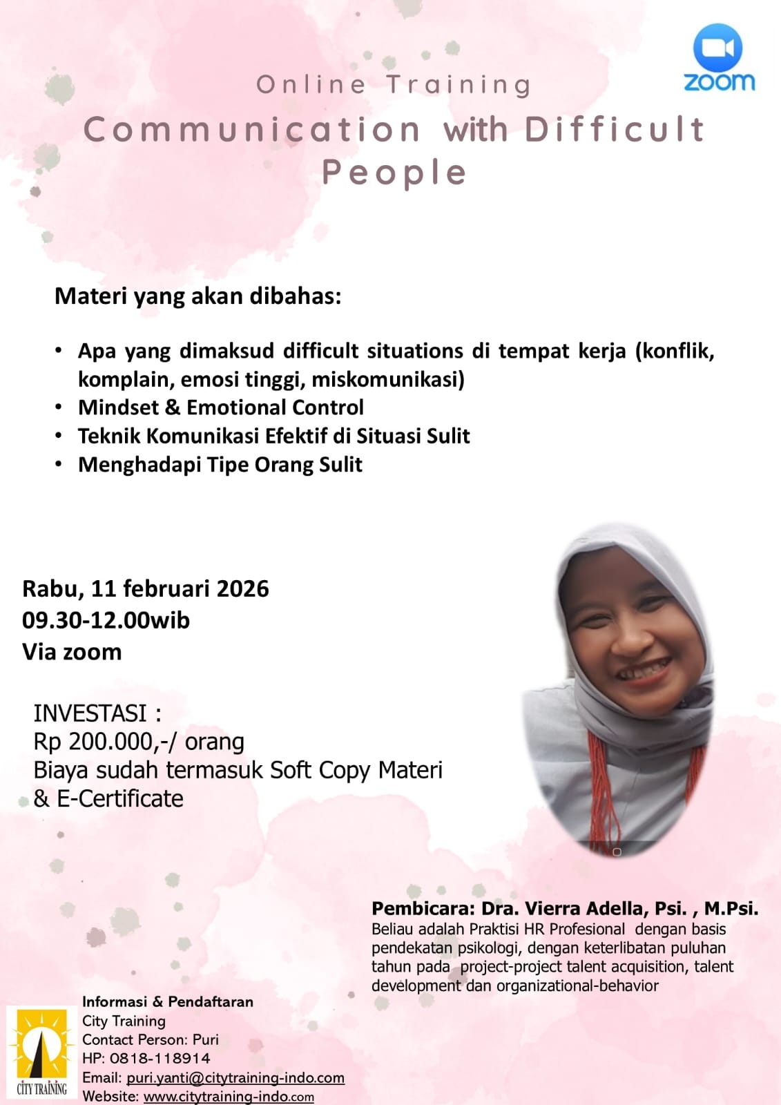 | 12 | Communication for Difficult Situations | Kamis, 5 Februari 2026 | 09.30-12.00 WIB | Zoom | Rp 200.000,- | Viera Adella |