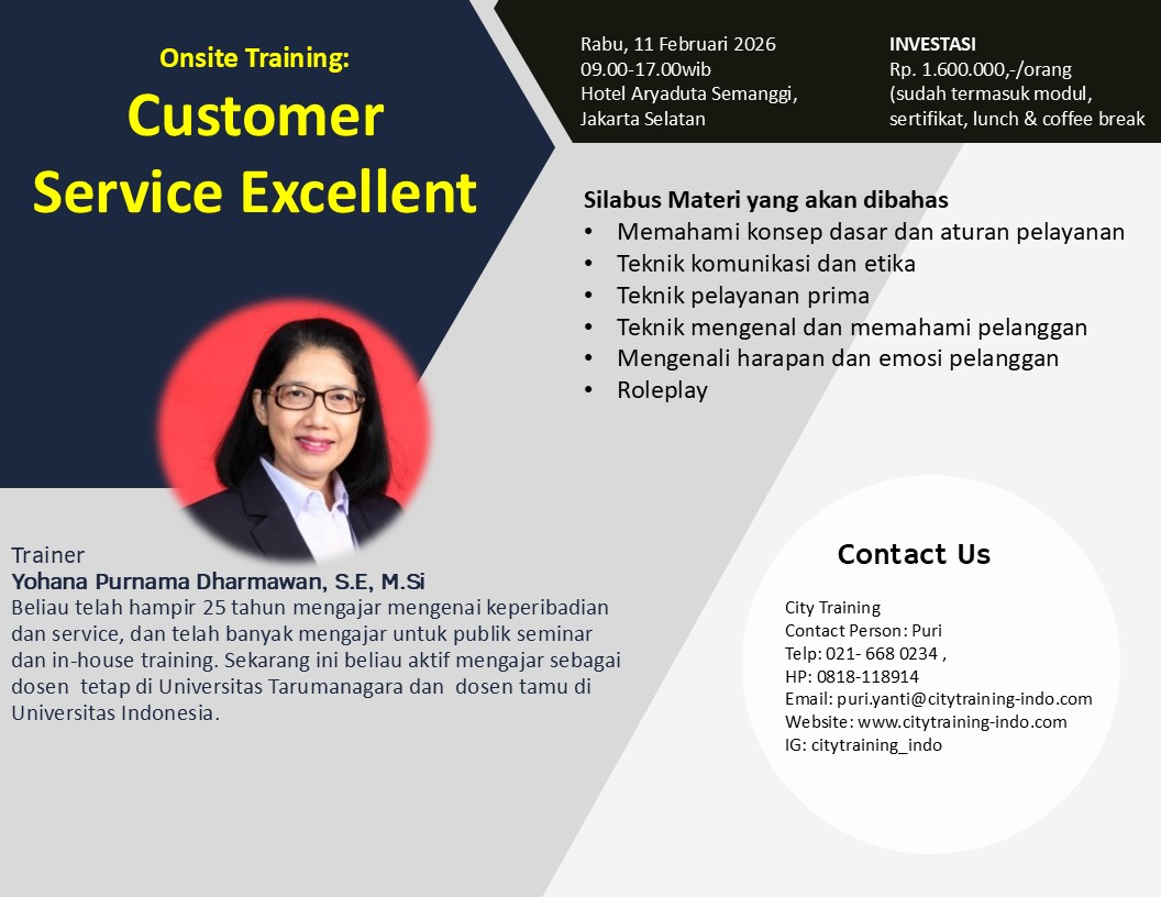 | 15 | Service Excellent | Rabu, 11 Februari 2026 | 09.00-17.00 WIB | Hotel Aryaduta Semanggi, Jakarta Selatan | Rp 1.600.000,- | Yohana Purnama Dharmawan |