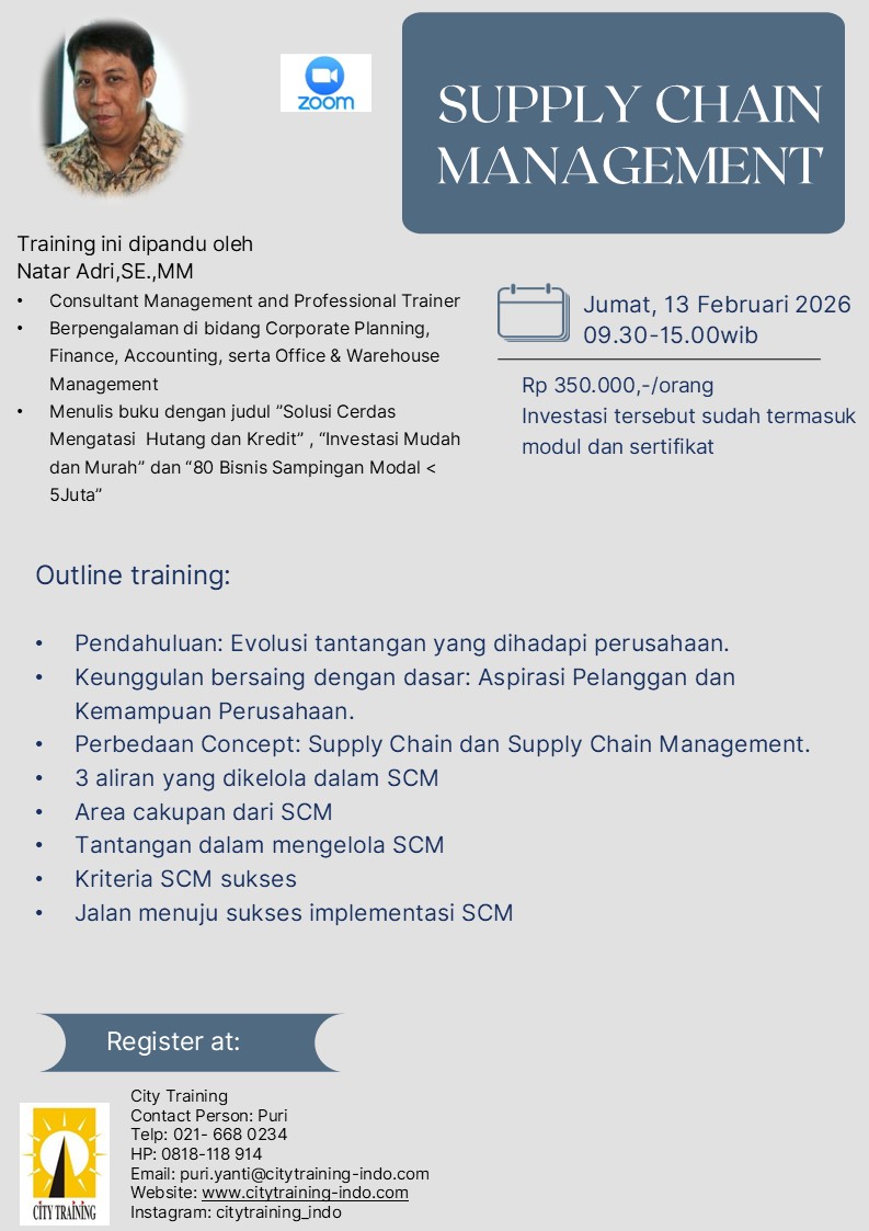 | 13 | Supply Chain Management | Kamis, 5 Februari 2026 | 09.00-17.00 WIB | Hotel Aryaduta Semanggi, Jakarta Selatan | Rp 1.600.000,- | Natar Adri |