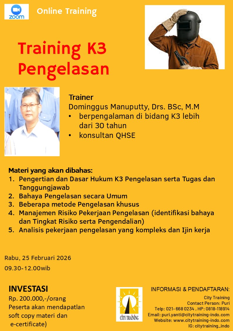 | 26 | K3 Manufacturing | Sabtu,11 April 2026 | 09.30-12.00 WIB | Zoom | Rp 200.000,- | Natar Adri |
