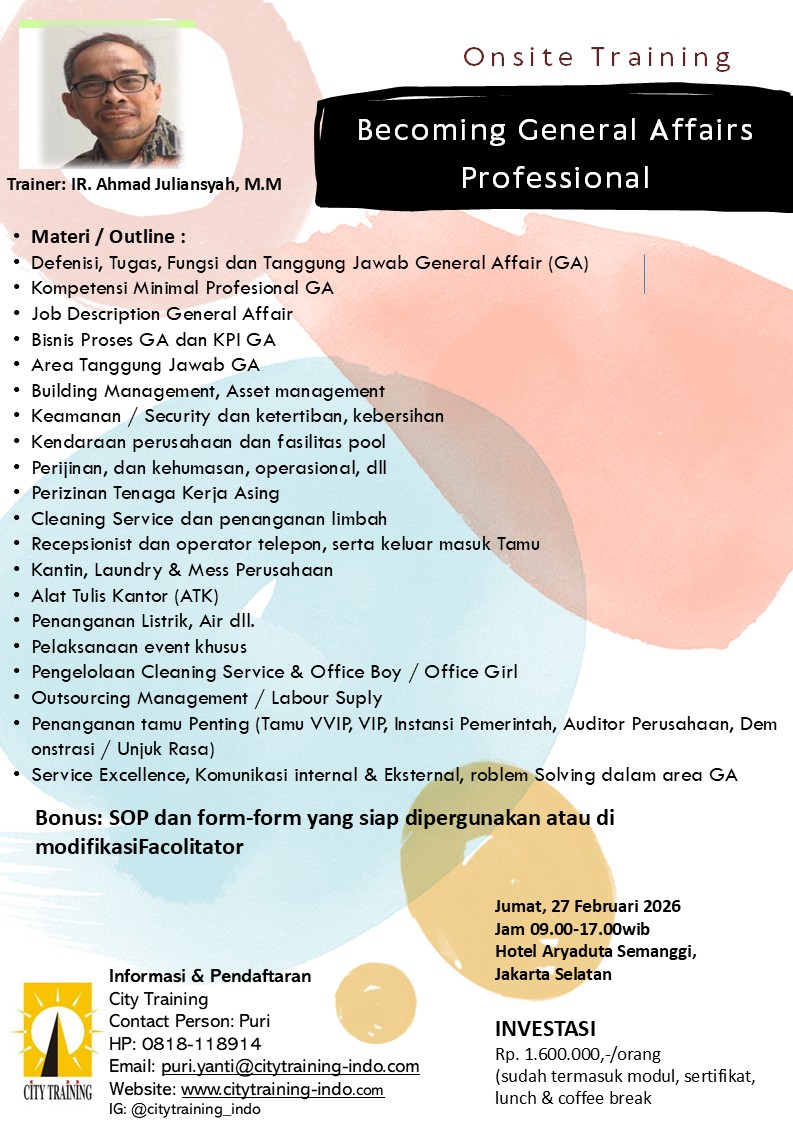 | 18 | Becoming a Professional GA | Jumat, 27 Februari 2026 | 09.00-17.00 WIB | Hotel Aryaduta Semanggi, Jakarta Selatan | Rp 1.600.000,- | Ahmad Juliansyah |