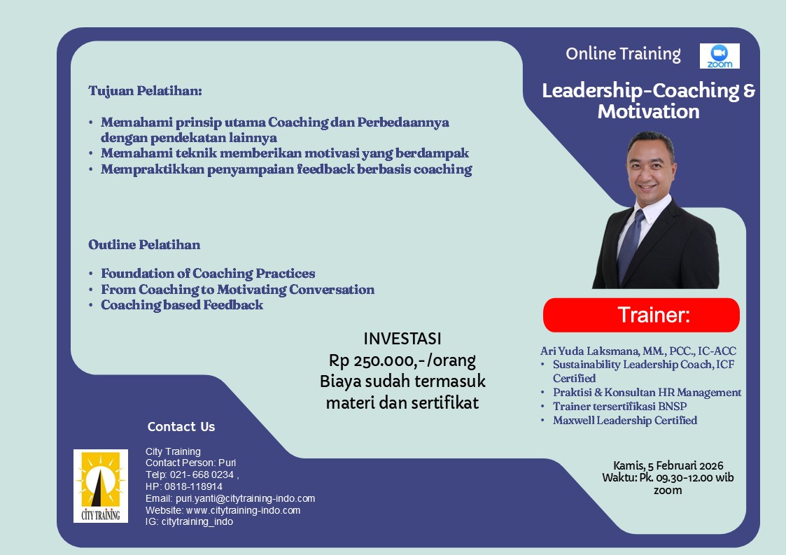 | 11 | Leadership-Coaching & Motivation | Selasa, 3 Februari 2026 | 09.00-17.00 WIB | Hotel Aryaduta Semanggi, Jakarta Selatan | Rp 1.600.000,- | Ari Yuda Laksmana |