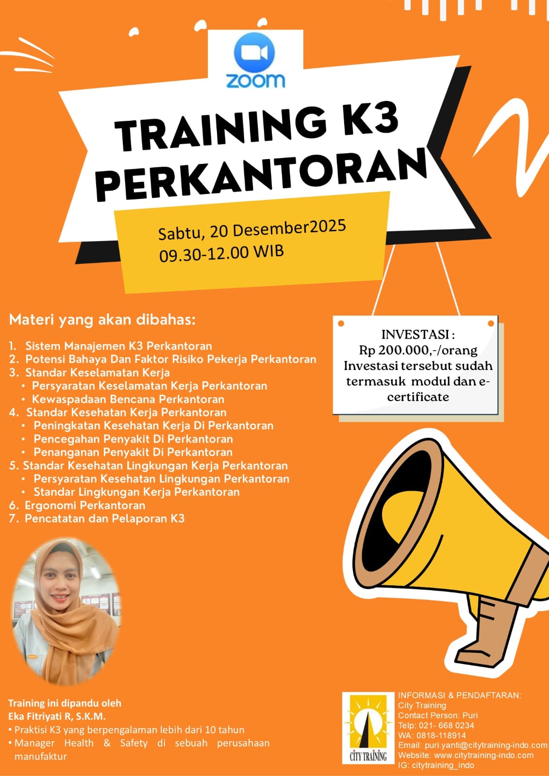 | 84 | K3 Perkantoran | Sabtu, 1 November 2025 | 09.30-12.00 WIB | Zoom | Rp 200.000,- | Eka Fitriyati | |