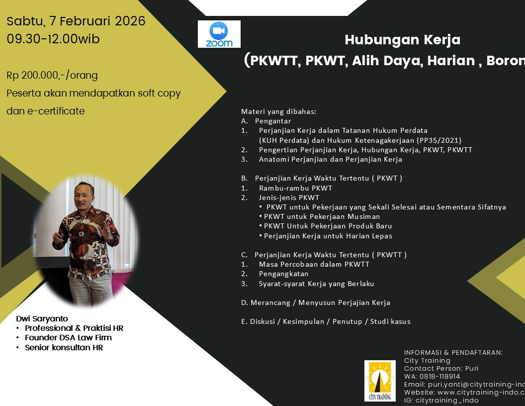 | 14 | PKWT, PKWTT & Alih Daya Aplikasi UUCK & PP 35/2021 | Sabtu, 7 Februari 2026 | 09.30-12.00 WIB | Zoom | Rp 200.000,- | Dwi Saryanto |